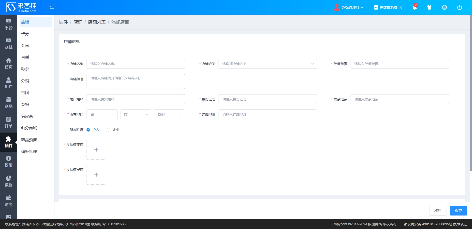 店铺功能开关:开启/关闭,可由管理人员设置。店铺插件关闭后,客户端隐藏店铺入口、搜索店铺功能。