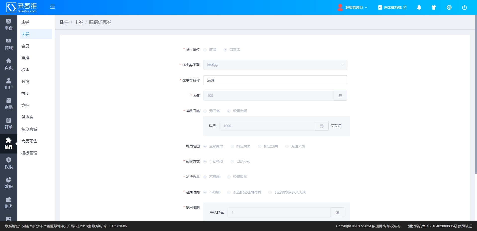 消费门槛和可用范围:可用范围支持三个选项:全部商品、指定商品、指定分类,消费门槛的金额可自行设置,用户使用优惠券时,需同时满足消费门槛和可用范围这两个条件,方可使用优惠券。