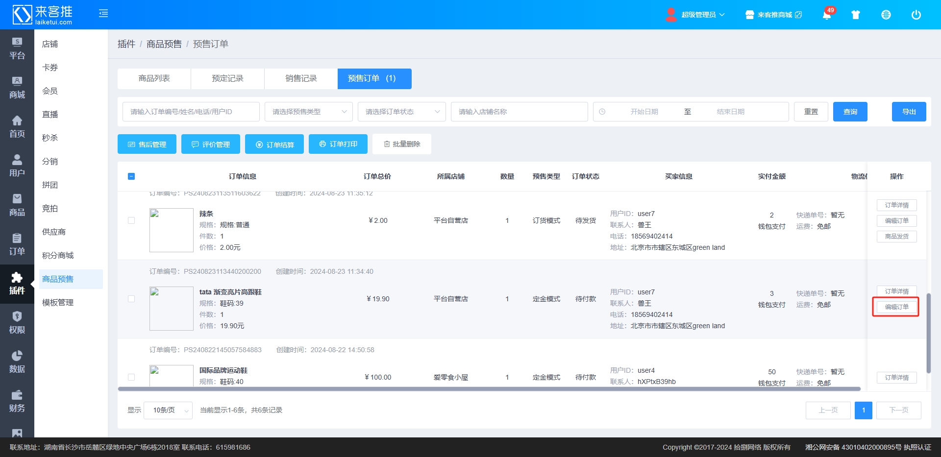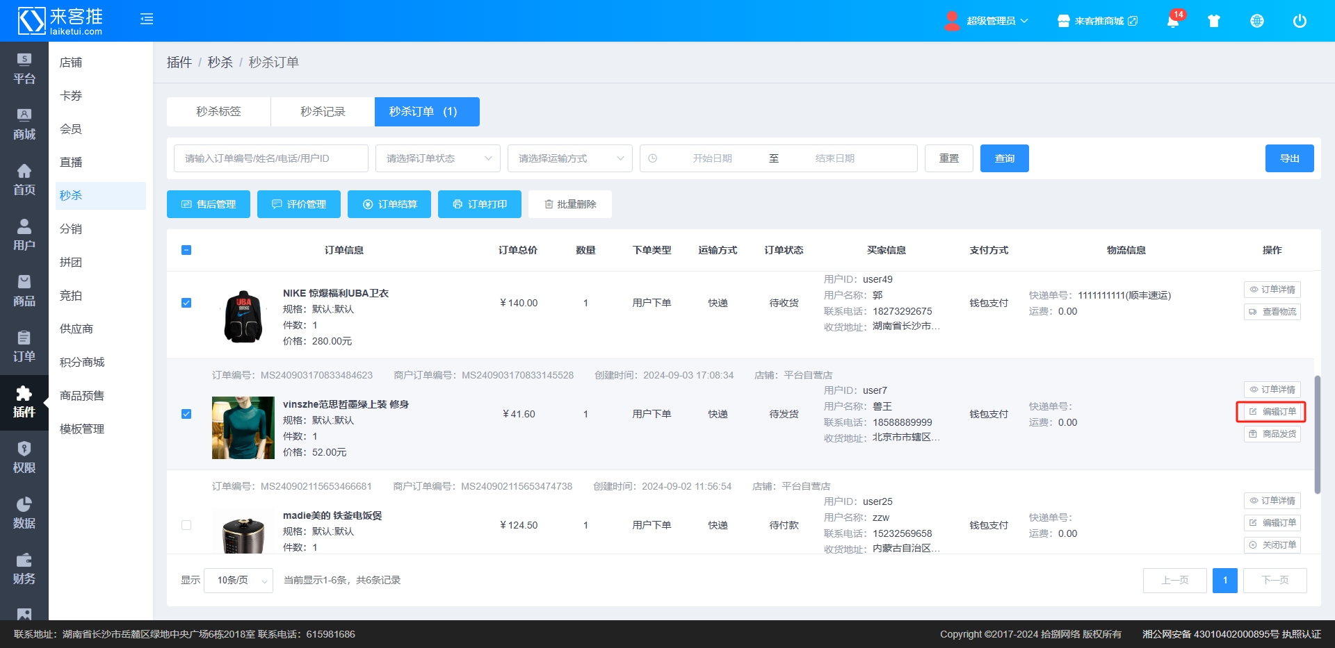 进入商城,点击插件->直播->直播订单,可根据订单编号/姓名/电话/用户ID、订单状态、日期等进行查询,数据超出10条,则分页展示。点击【重置】按钮,可清空查询条件。