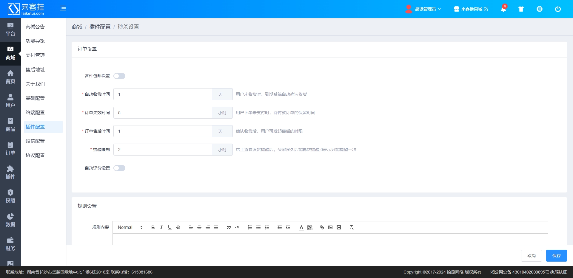 在店铺管理页面,点击商城->插件配置,先在店铺设置中,设置店铺默认LOGO、自动删除时间、商品上传方式、提现设置,点击【保存】。