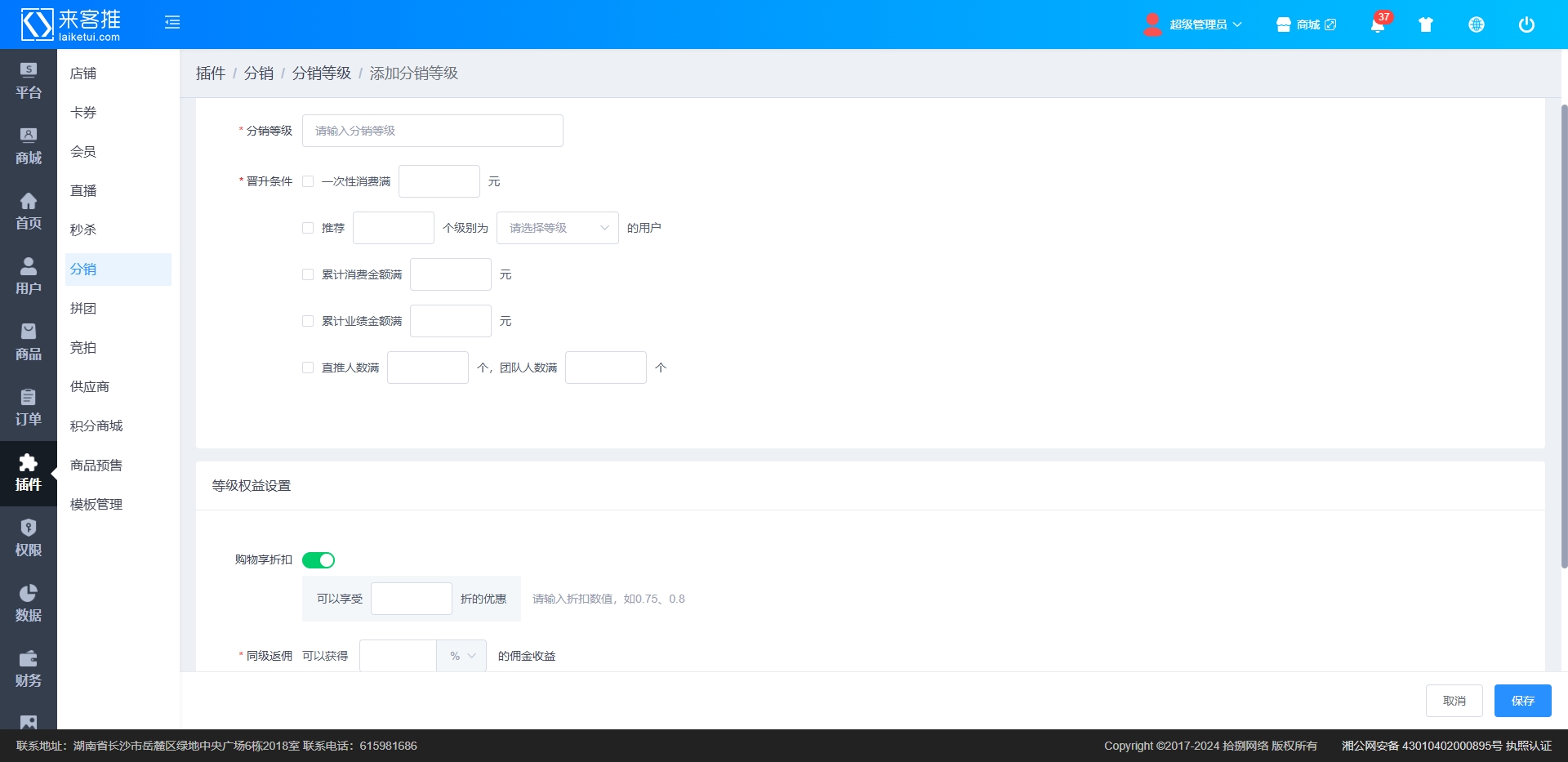 进入商城,点击商城->插件配置->会员->会员设置,开启会员插件,设置会员的基本参数,保存成功,立即生效。