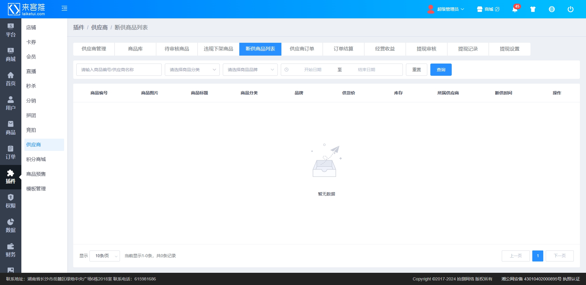 进入商城,点击插件管理->供应商->供应商管理,输入供应商名称、选择供应商类型/所属性质/状态、日期,点击【查询】按钮,可搜索到具体供应商,点击【重置】按钮,可清空查询条件。