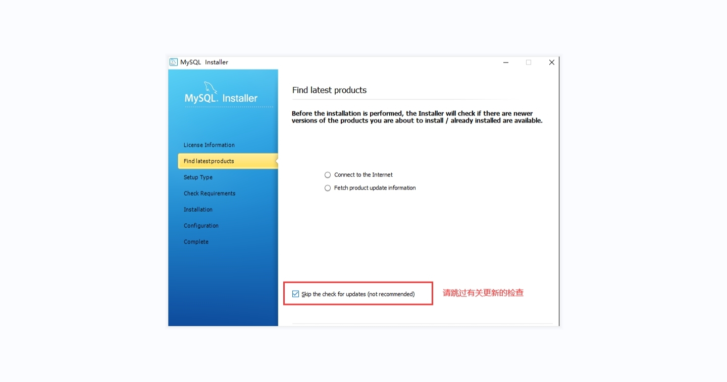 3、勾选Skip the check for updates(请跳过有关更新的检查)。