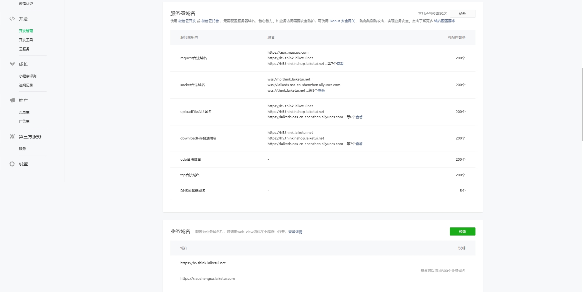 同一页面中,请继续配置下面【服务器域名】(即后台域名地址),【业务域名】(即前端地址)。