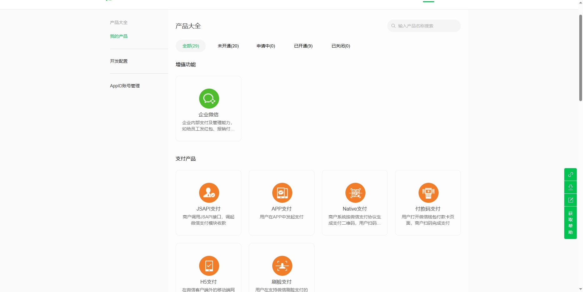 3、登陆成功,点击【产品中心】-【我的产品】中开通【JSAPI支付】功能;