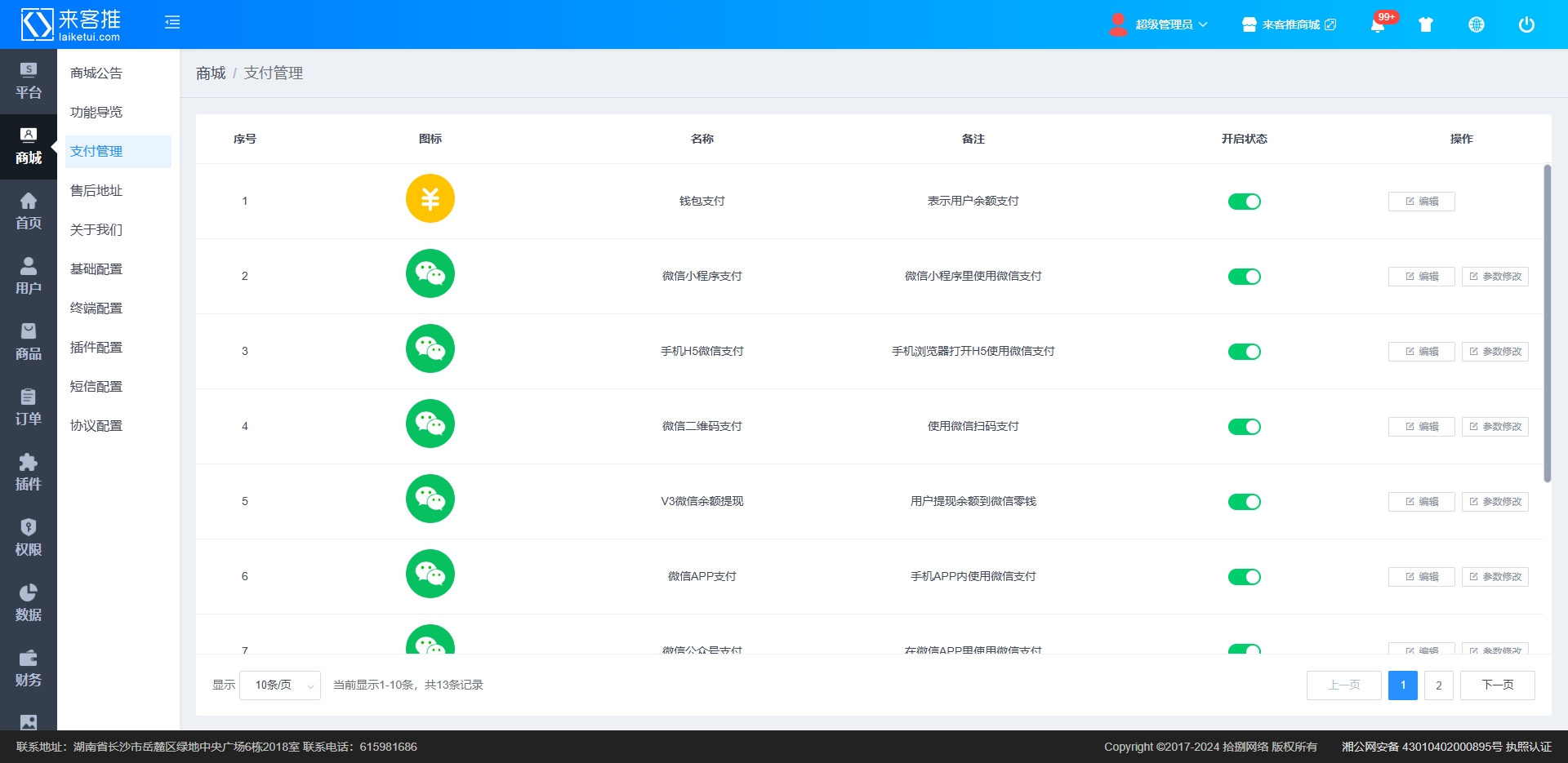 点击商城->支付管理,页面跳转到支付管理,可以进行‘是否显示’‘编辑’参数修改’等操作。