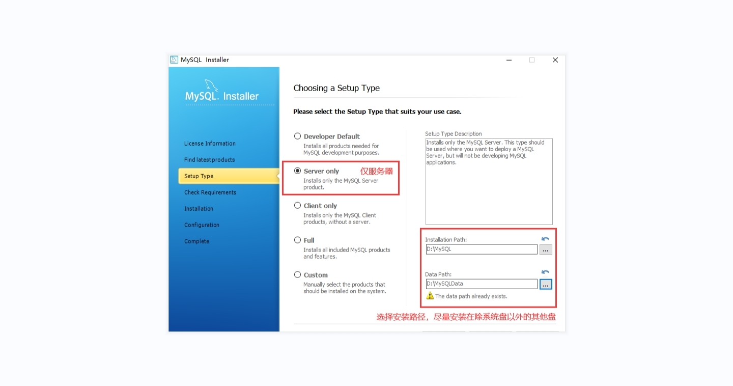 4、选择第二项:Server only(仅作为服务器),安装路径可以修改,也可以默认为C盘,但尽量安装在除系统盘以外的其他盘,然后点击下一步next。