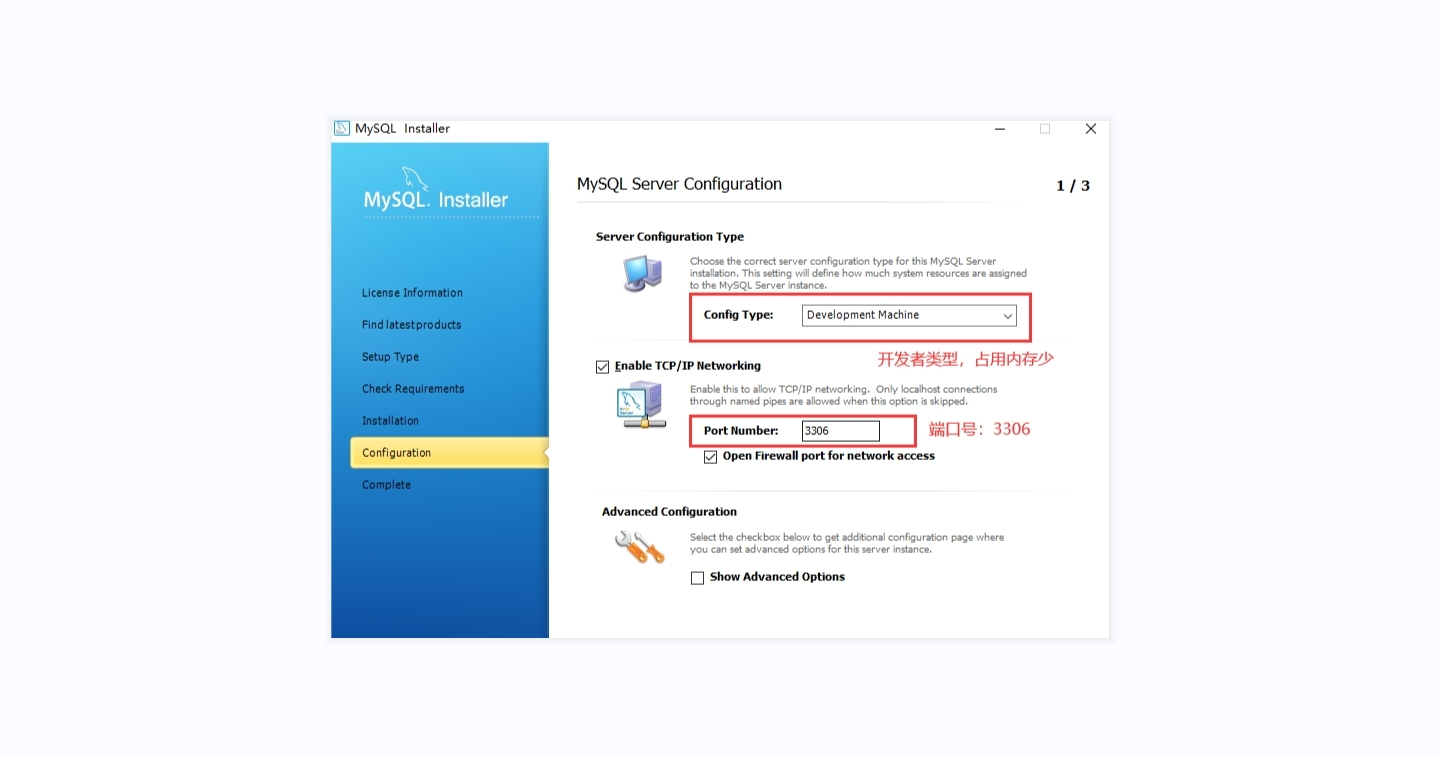 a. 选择服务器类型: Developer Machine(开发者类型):占用内存资源最少,适用于开发者使用。 Server Machine(服务器类型):占用内存稍多一些,主要用作服务器的机器使用。 Dedicated MySQL Server Machine(专用MySQL服务器):占用内存最多,专门用来做数据库服务器的机器使用。 b. 设置服务器端口号: 端口号默认为3306。