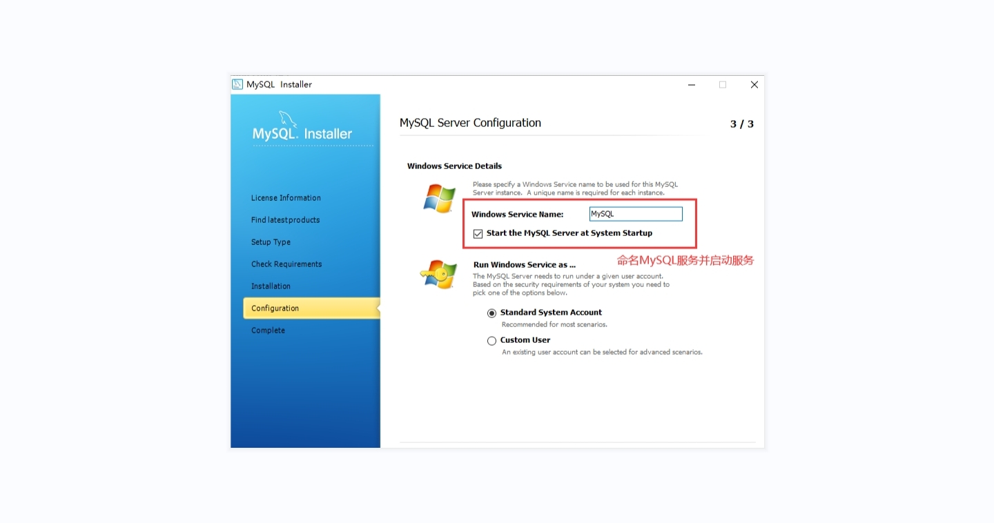 8、命名MySQL服务名称,并勾选服务开机启动(Start the MySQL Server at System Startup)和标准系统账户(Standard System Account),确定配置后点击下一步next。